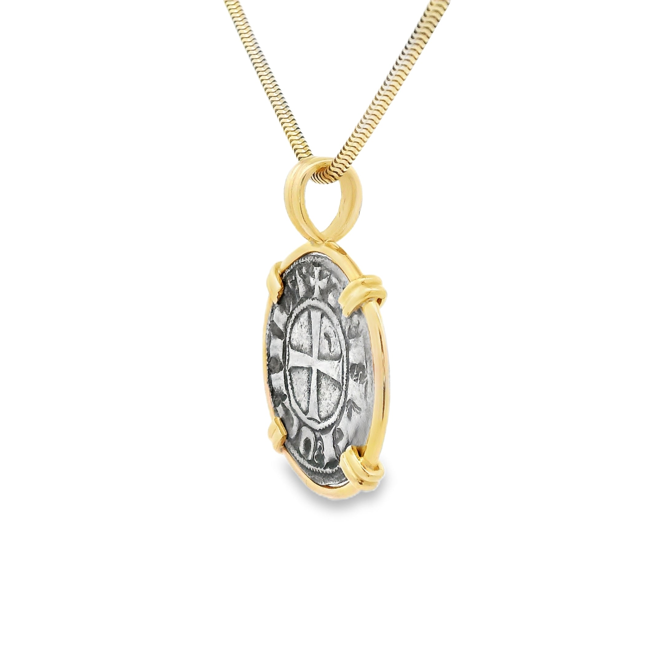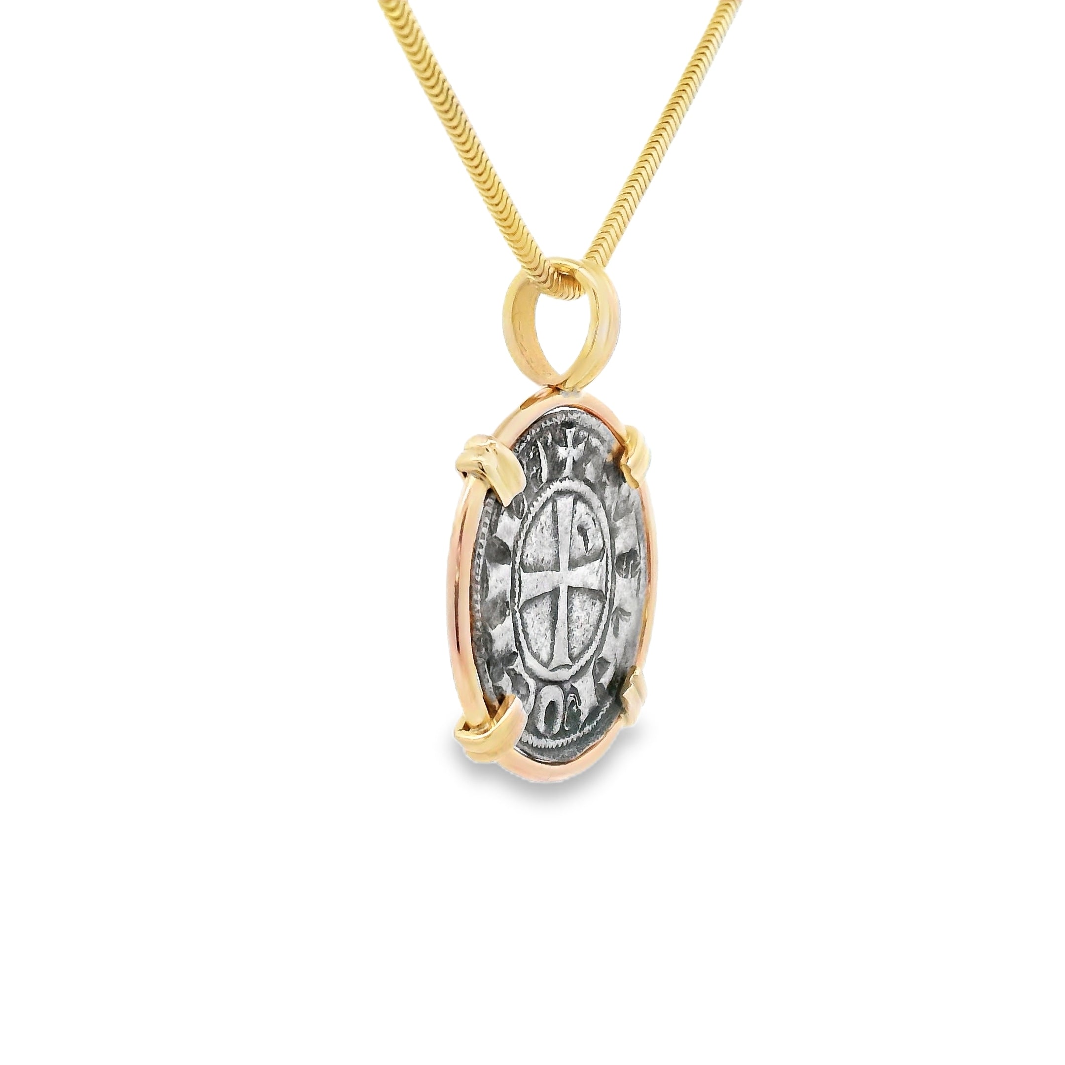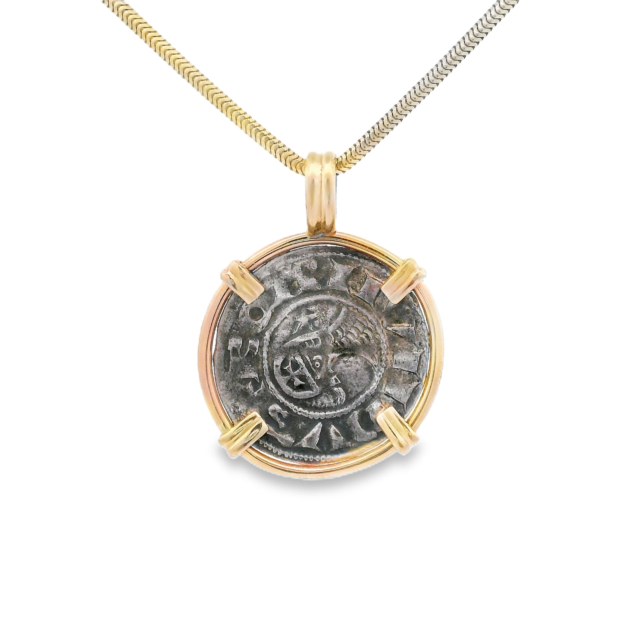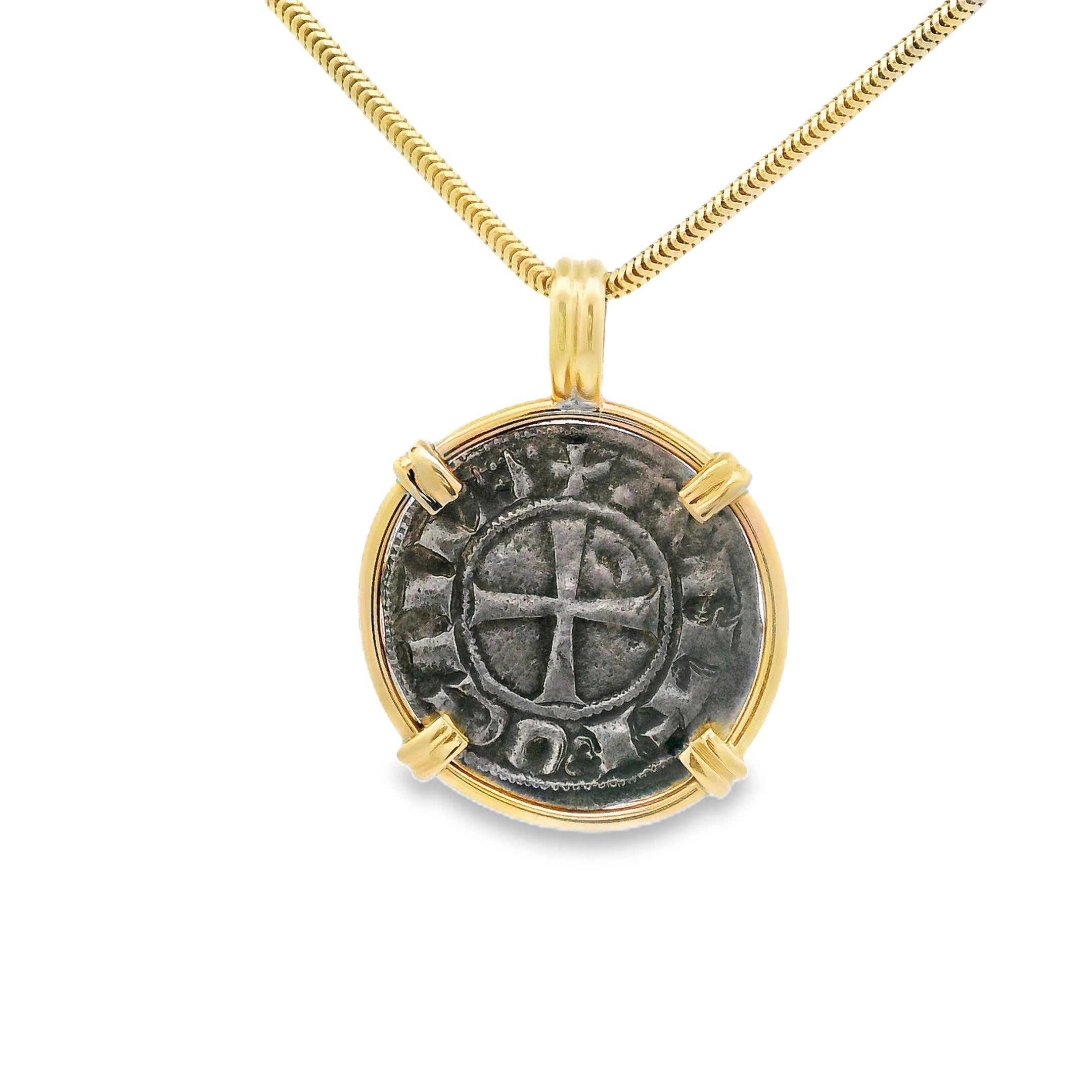 Encased in a handcrafted 14K gold bezel, this coin pendant is about the size of a nickel. It serves not only as a piece of fine jewelry but also as a badge of honor and a reminder of the historical significance of the Crusades.